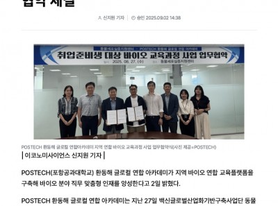 [언론보도] POSTECH, 동물세포실증지원센터 업무 협약 체결